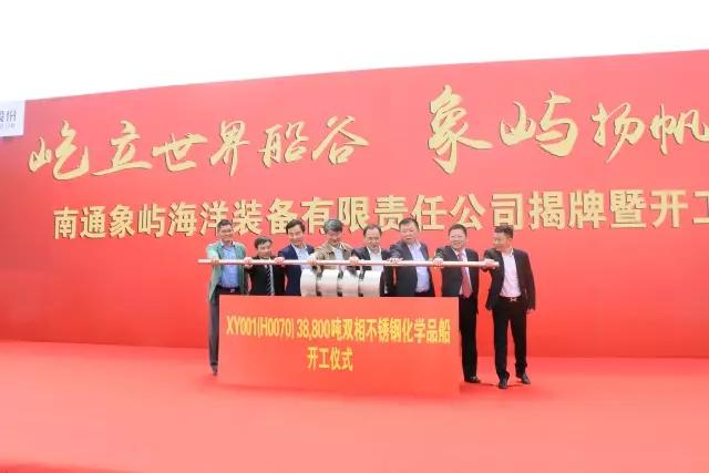 首制船“XY001”號(hào)38800噸不銹鋼化學(xué)品船同期開工。江蘇省經(jīng)信委副主任、國(guó)防科工委主任秦雁,南通市委常委、通州區(qū)委書記宋樂偉,南通市副市長(zhǎng)徐新民,通州區(qū)區(qū)委副書記、區(qū)長(zhǎng)陳永紅,華融航運(yùn)金融租賃有限公司總經(jīng)理樊旭平,象嶼集團(tuán)總裁陳方,中海重工董事局主席李明,南通象嶼副董事長(zhǎng)朱建華,共同推動(dòng)38800噸不銹鋼化學(xué)品船開工桿!